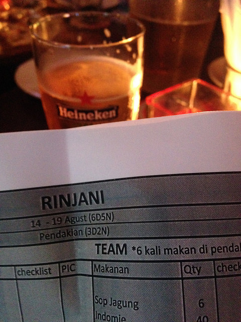 Selama sebulan ini, saya berusaha melengkapi peralatan dan logistik pendakian. Beruntung teman-teman memiliki check list yang lengkap dan mudah dipahami. Bahkan kami juga menyempatkan diri untuk melakukan rapat koordinasi, yang walaupun berkakhir ‘tragis’ dengan ‘asupan pembuka’ minuman dari Meksiko bernama ‘Tequila‘ dan penutup ala De Hooi.. “Brainwash“.